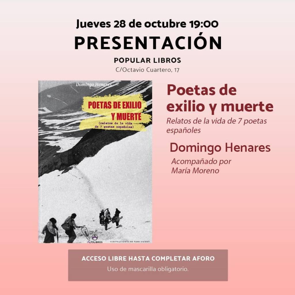 El escritor y cantautor Domingo Henares hará un acto de presentación de su disco Poetas de exilio y muerte el próximo 28 de Octubre de 2021 a las 19:00 horas en la librería Popular, acompañado de María Moreno.